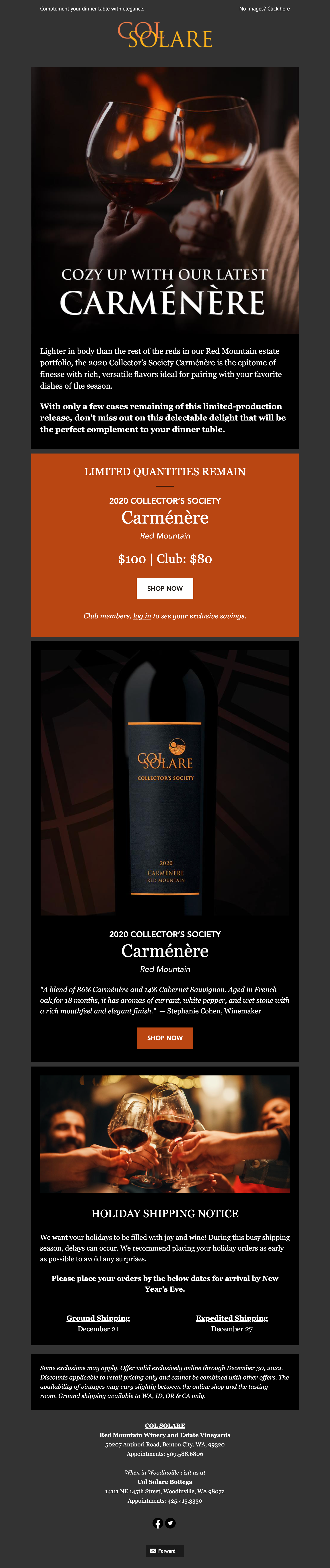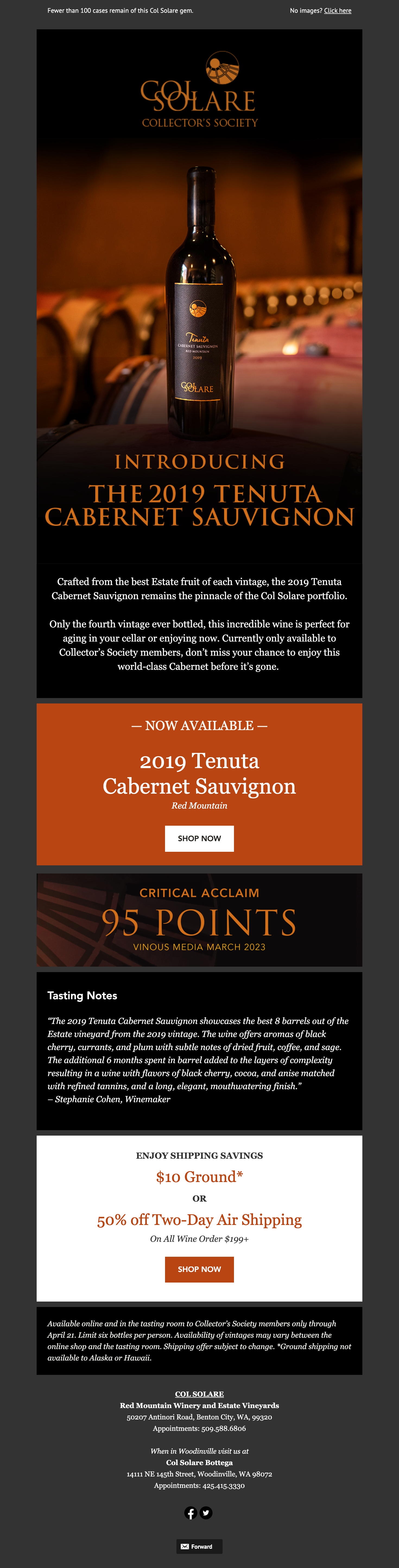 Col Solare Winery is very luxurious brand with top-tier wine with a dark and moody aesthetic. The winery is the partnership between two influential wine producers who are recognized leaders in their respective regions: Tuscany's Marchesi Antinori and Washington state's Chateau Ste. Michelle. Col Solare unites these who unique viticultural and winemaking cultures to produce and ultra-luxury Cabernet Sauvignon-based wine.